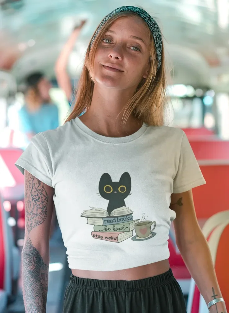 model wearing white t-shirt with black cat fun design